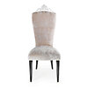 The Cimasa Venetian Style Chair is a masterpiece of design, blending timeless elegance with modern sophistication. Crafted with meticulous attention to detail, this chair features a high, stately backrest crowned with an ornate, silver filigree that exudes a regal presence. The plush seating is upholstered in a luxurious, muted silver velvet that is both visually appealing and sumptuously tactile, promising comfort and style.The chair's legs are a bold contrast in jet black, tapering elegantly to create a striking silhouette. These legs are tipped with chic, golden accents that add a touch of glamour and ensure stability and durability. This exquisite chair is not just a piece of furniture, but a statement of artistry and class, perfect for enhancing any room with its majestic charm and sophisticated palette.