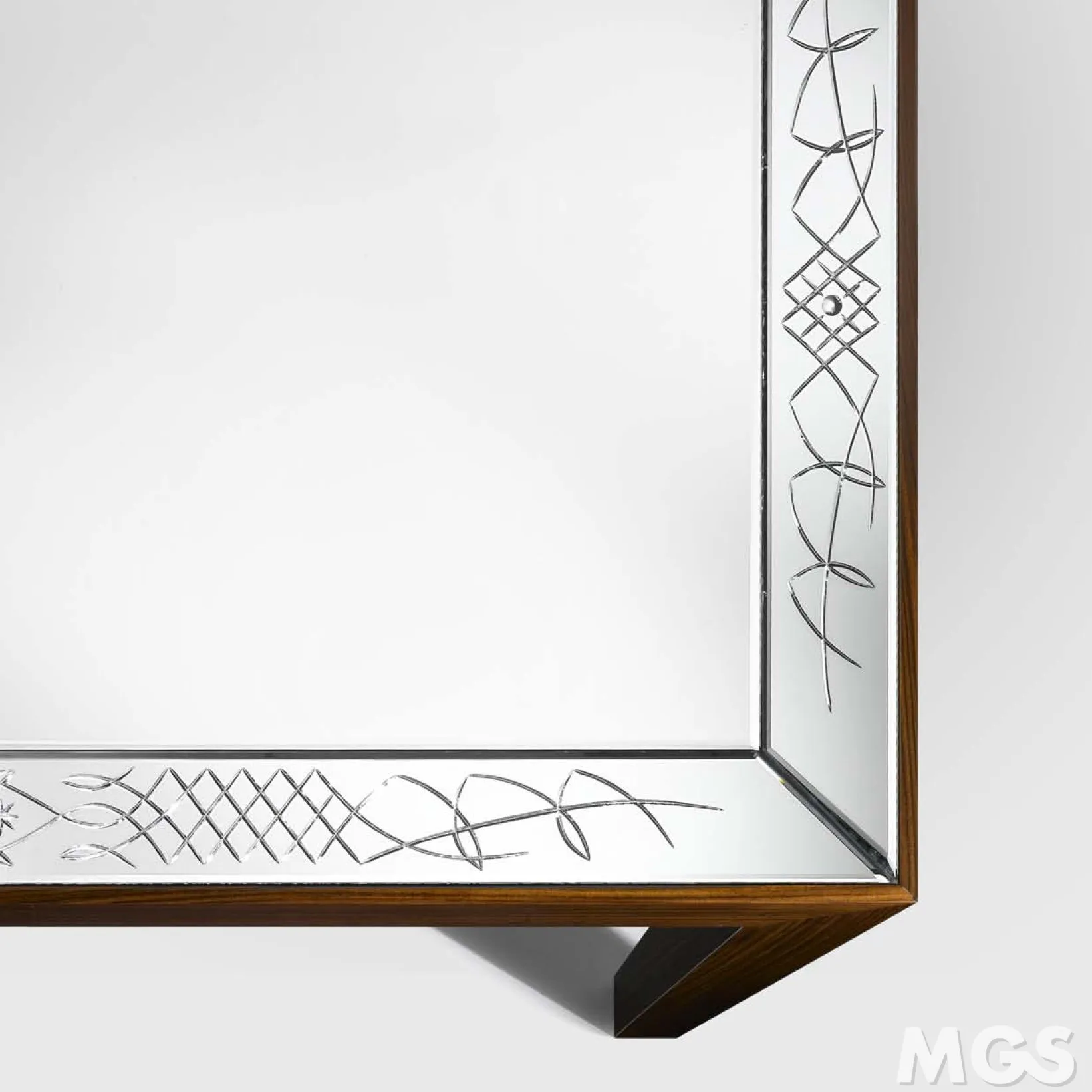 Gloss lacquered rosewood table with extra light mirrored top engraved in Déco style. Design Leo De Carlo.The Mirwood Table is a stunning piece of Venetian-style furniture that exudes elegance and sophistication. Its intricate design and craftsmanship showcase the timeless beauty of Murano glass. The table features a round glass top supported by gracefully curved wooden legs, adorned with exquisite hand-blown glass details in vibrant colors. With its unique blend of traditional Italian artistry and contemporary style, the Mirwood Table is sure to be a captivating centerpiece in any living space.