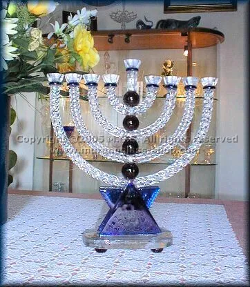 Transparent blue Crystal decorated with goldThe Hanukkà 2003 is a beautifully crafted candelabra designed for Hanukkah celebrations. Made by skilled artisans, this elegant piece showcases the tradition and artistry of murano glass. With its unique design and delicate details, the Hanukkà 2003 is both a functional and decorative item, perfect for adding a touch of beauty and warmth to any Hanukkah festivities.